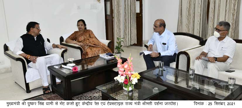 देहरादून। मुख्यमंत्री पुष्कर सिंह धामी से शनिवार को मुख्यमंत्री आवास में केंद्रीय रेल एवं टेक्सटाइल राज्य मंत्री श्रीमती दर्शना जरदोश ने भेंट की। उन्होंने मुख्यमंत्री से राज्य में रेल परियोजनाओं के विकास संचालन एवं आवश्यक अवस्थापना सुविधाओं के संबंध में विचार विमर्श किया।