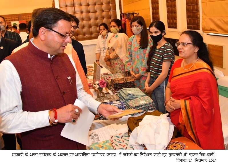 देहरादून। मुख्यमंत्री पुष्कर सिंह धामी ने मंगलवार को सुभाष रोड स्थित होटल पेसिफिक में उद्योग विभाग द्वारा आयोजित आजादी के अमृत महोत्सव के अवसर पर वाणिज्य उत्सव में मुख्य अतिथि के रूप में प्रतिभाग किया। कार्यक्रम की शुरुआत मुख्यमंत्री ने दीप प्रज्ज्वलित कर किया एवं स्टॉलों का निरीक्षण किया।
