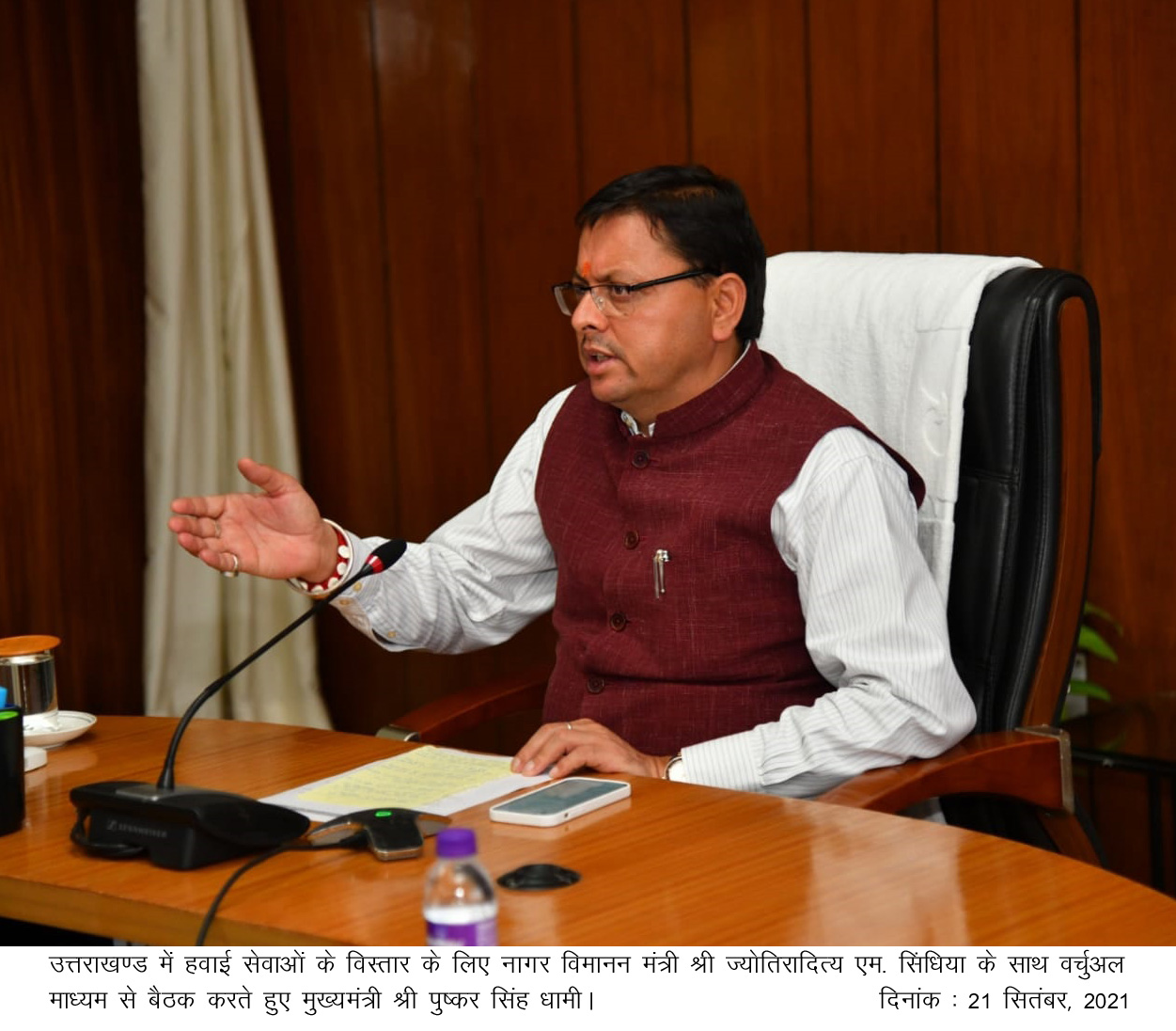 देहरादून। मुख्यमंत्री पुष्कर सिंह धामी ने मंगलवार को सचिवालय से वर्चुअल माध्यम से नागर विमानन मंत्री, भारत सरकार ज्योतिरादित्य एम. सिंधिया के साथ उत्तराखण्ड में हवाई सेवाओं को बढ़ाने के लिए महत्वपूर्ण बैठक की।