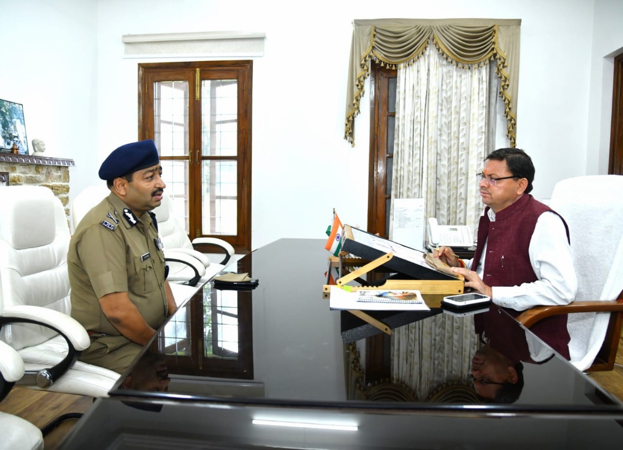 देहरादून। मुख्यमंत्री पुष्कर सिंह धामी से मंगलवार को मुख्यमंत्री आवास में पुलिस महानिदेशक अशोक कुमार ने भेंट की। डीजीपी ने मुख्यमंत्री को राज्य में क़ानून व्यवस्था से सम्बंधित विभिन्न मुद्दों से अवगत कराया।